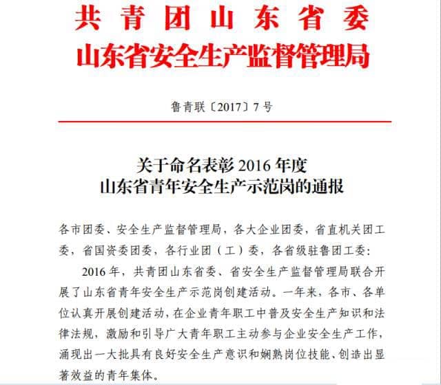 为激励引导全省广大青年职工强化安全生产意识,提高安全生产技能,参与安全生产管理,2016年共青团山东省委、山东省安全生产监督管理局联合开展了山东省青年安全生产示范岗创建活动。财神到app官方下载新产品班组荣获2016年度“山东省青年安全生产示范岗”